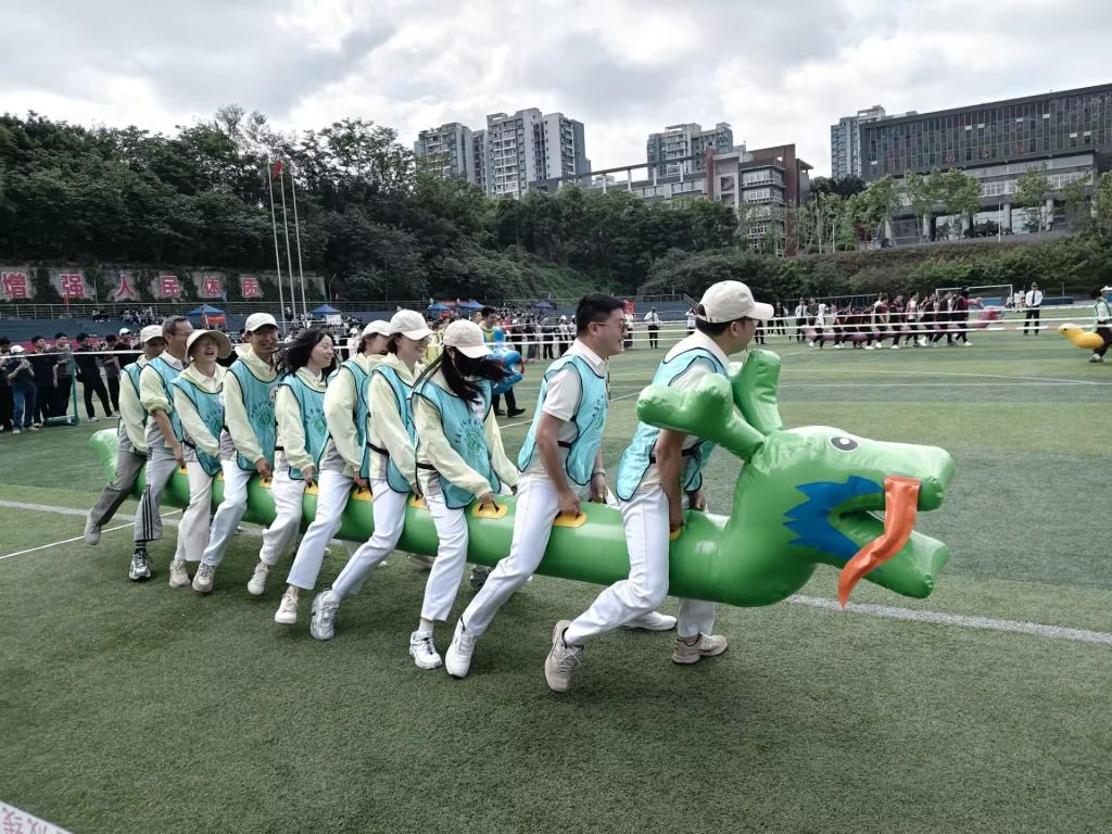 在“欢乐龙舟”项目中,队员们骑跨龙舟,喊着整齐的口令,默契配合、奋力冲向终点,展现了出色的团队协作能力。“一圈到底”环节,老师们手拉手围成一排,在不松手的情况下灵活传递呼啦圈,现场气氛紧张而欢快。“夹球接力”比赛中,队员们用腋下和膝关节夹球奋力前行,虽偶有掉球的小插曲,但大家毫不气馁、迅速调整、坚持完成比赛。最后的“拔河比赛”将现场气氛推向高潮,医技分工会的老师们紧握长绳、齐心协力、顽强拼搏,场边加油声、呐喊声此起彼伏。
